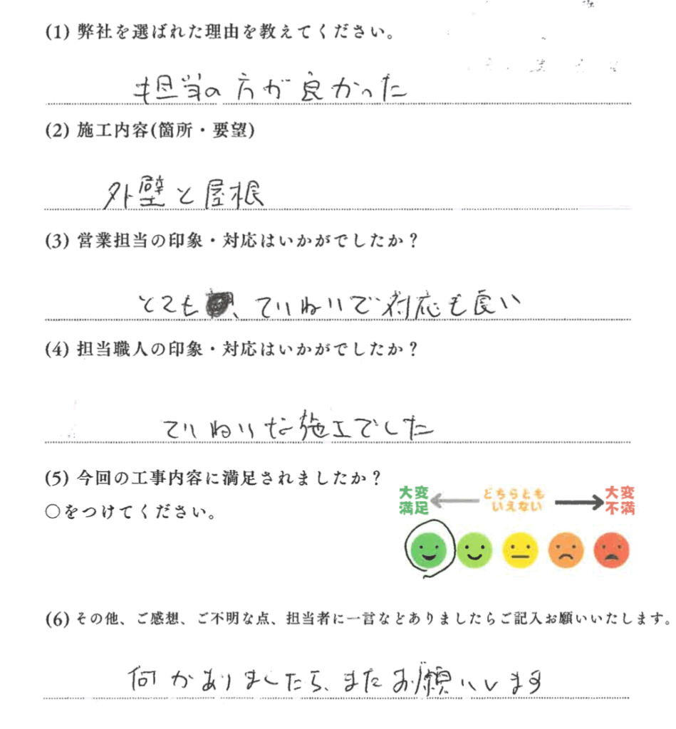 こちらでは、外壁塗装をご依頼いただいたお客様の声をご紹介しています。「どこに頼めばいいかわからない」「施工後のイメージが不安」そんな方はぜひ、実際のご感想をご覧ください。信頼できる業者選びの参考にしていただけます。
